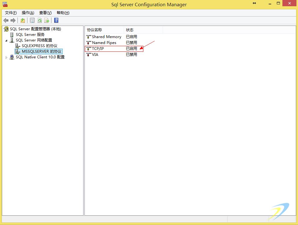 (2)打開SQL Server配置管理器后,選擇SQL Server網(wǎng)絡配置下面的MSSQLSERVER,然后看右邊里面的TCP/IP是否為“已啟用”